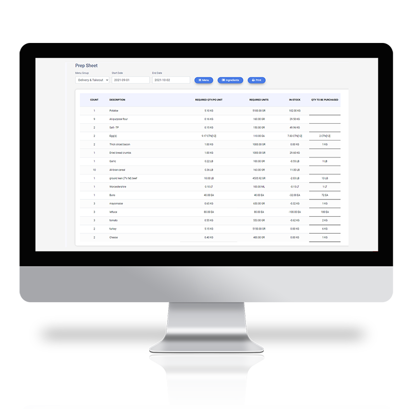 Catering for large events requires preparing in advance. Our prep sheet allows you to view the stock requirements for a specific period. Depending on the menu items required for the event, the report will display each ingredient required and the quantity according to the catering event.